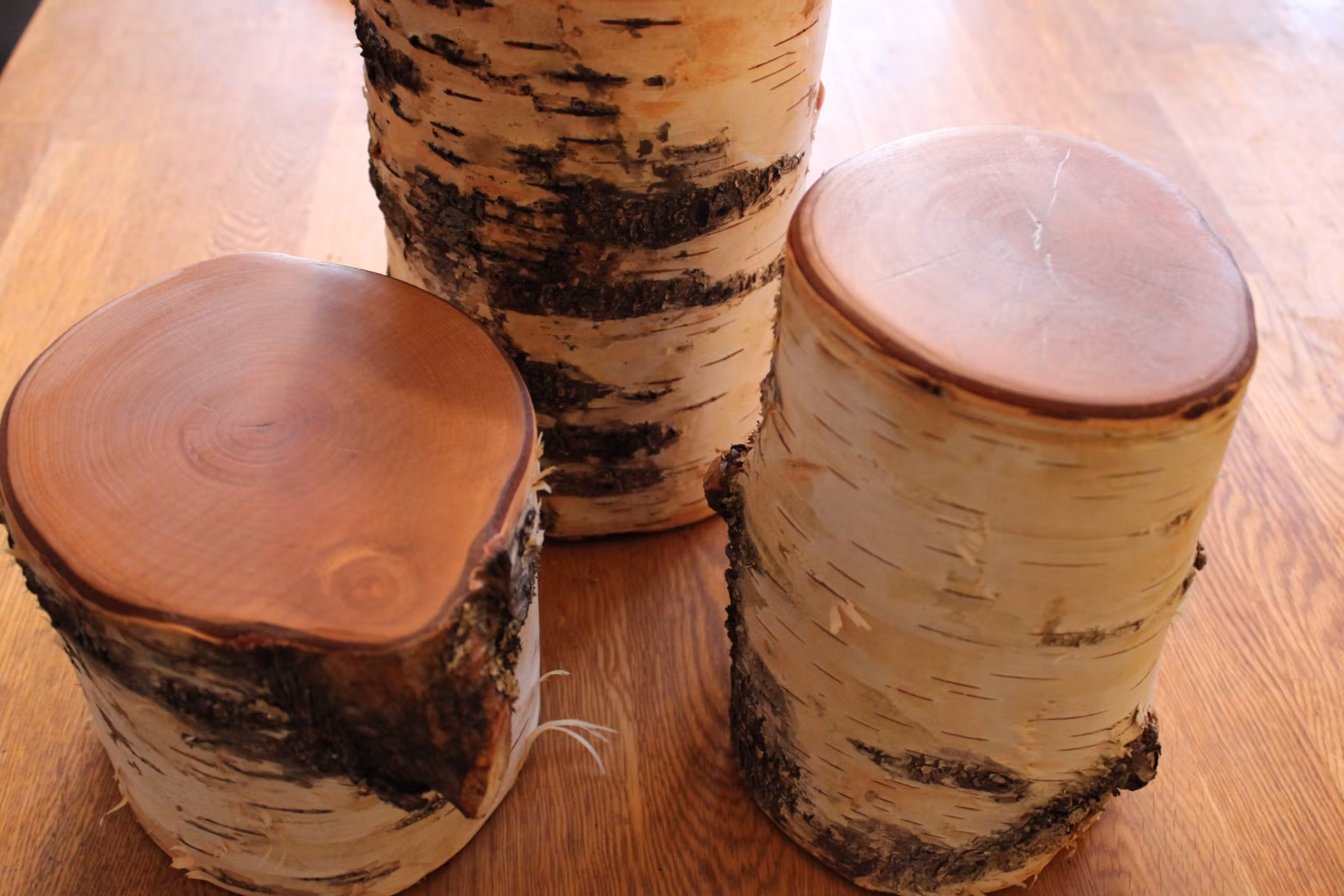 Specialbeställning till Södergarns kursgård. 15 st björkstubbar i olika diameter och höjd. Torkade i vår egna virkestork med barken/näver kvar. Putsade "ändar" som är behandlade med skärbrädeolja och skärbrädevax.